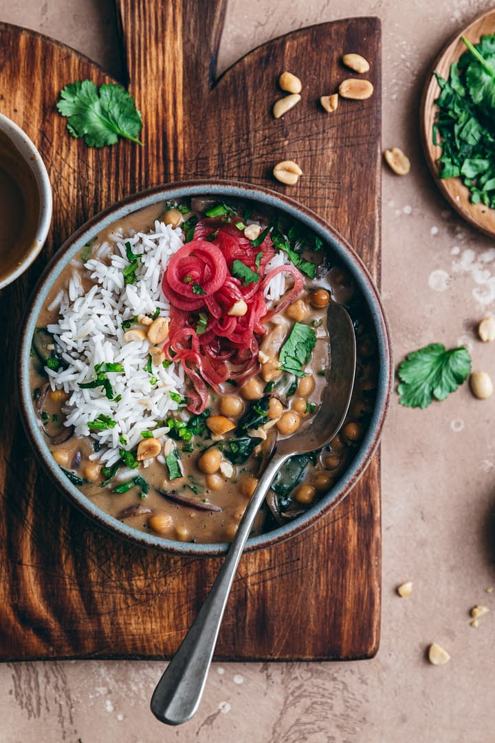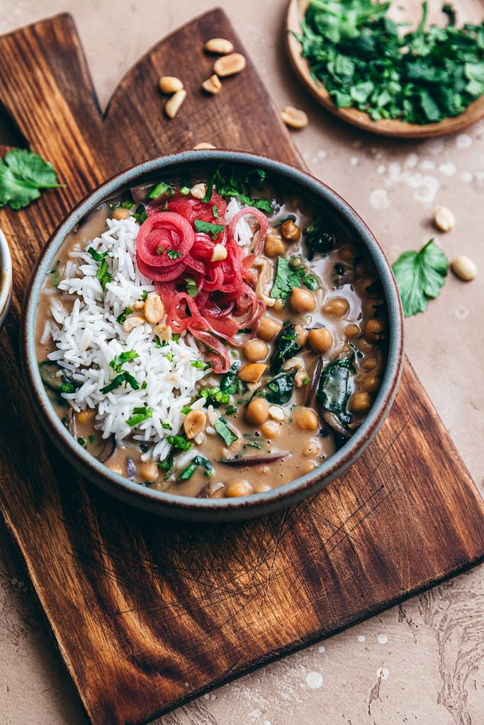 Les pois chiches, riches en protéines végétales et en fibres, sont la base de cette recette. Associés au lait de coco, ils créent une texture crémeuse et apportent une dose d’acides gras sains. Le beurre de cacahuète, quant à lui, ajoute une touche de protéines et de bonnes graisses, tout en rendant le plat encore plus délicieux. Servez ce plat avec une portion de céréales comme du riz, pour profiter d’une meilleurs absorption des protéines végétales.