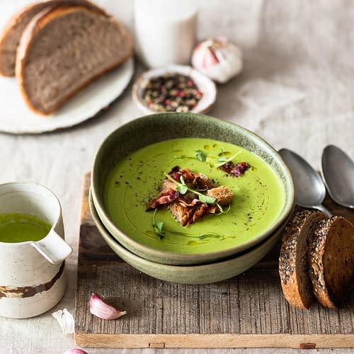 - Servez le velouté dans des bols avec avec le lard grillé et les croutons de pain.