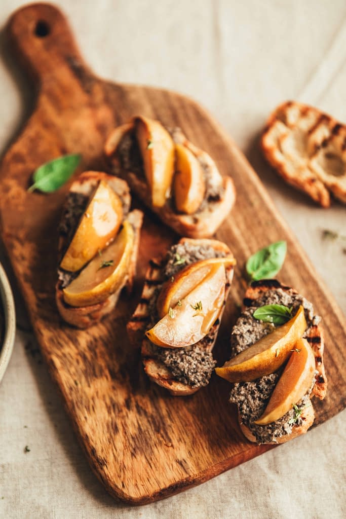 - Faire griller les tranches de pain au four. Les tartiner d’un peu de préparation aux champignons puis ajouter les poires rôties.
