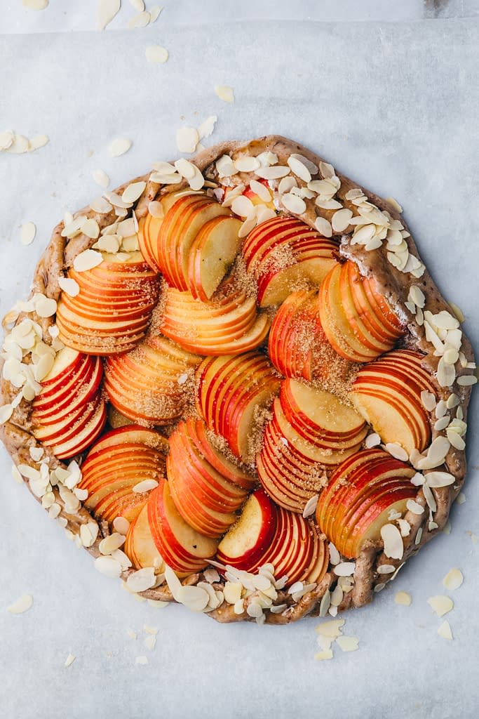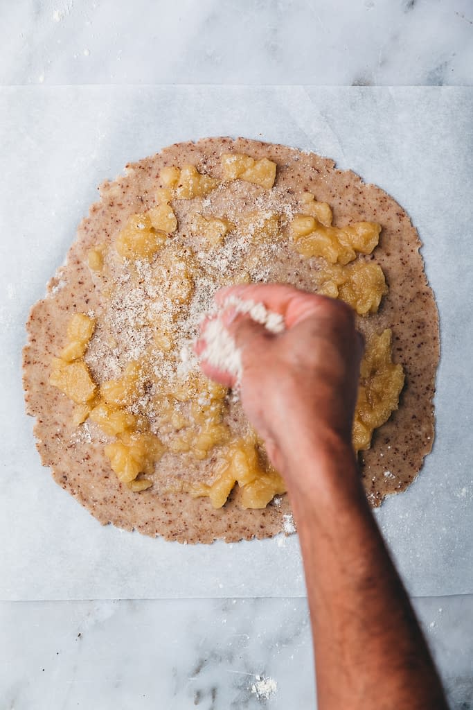 - Assemblage : Étalez la pâte et garnissez le fond de compote de pommes. Saupoudrez de poudre de noisettes et disposez les tranches de pommes au centre. Repliez les bords de la pâte sur les pommes. Saupoudrez d’un peu de sucre roux ou de sirop d’érable pour faire caraméliser les pommes à la cuisson. Ajoutez quelques amandes effilées sur les bords de la tarte.