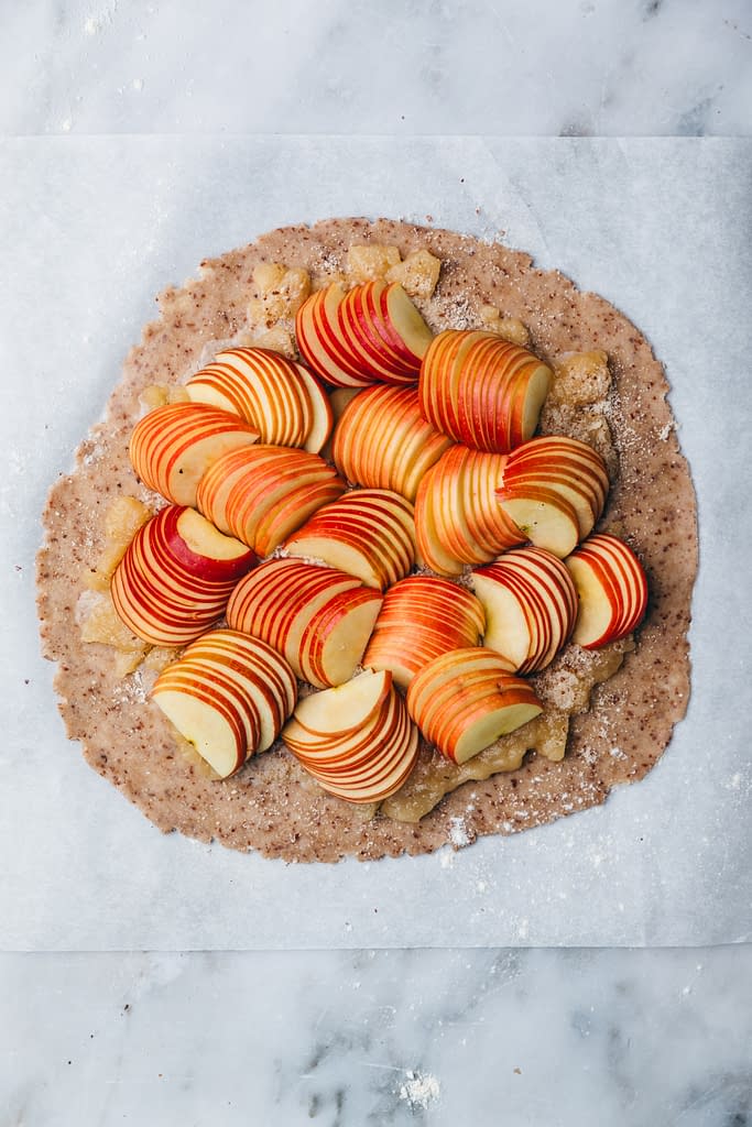 - – Disposez les tranches de pommes au centre de la pâte en laissant environ 5 cm de bord libre.