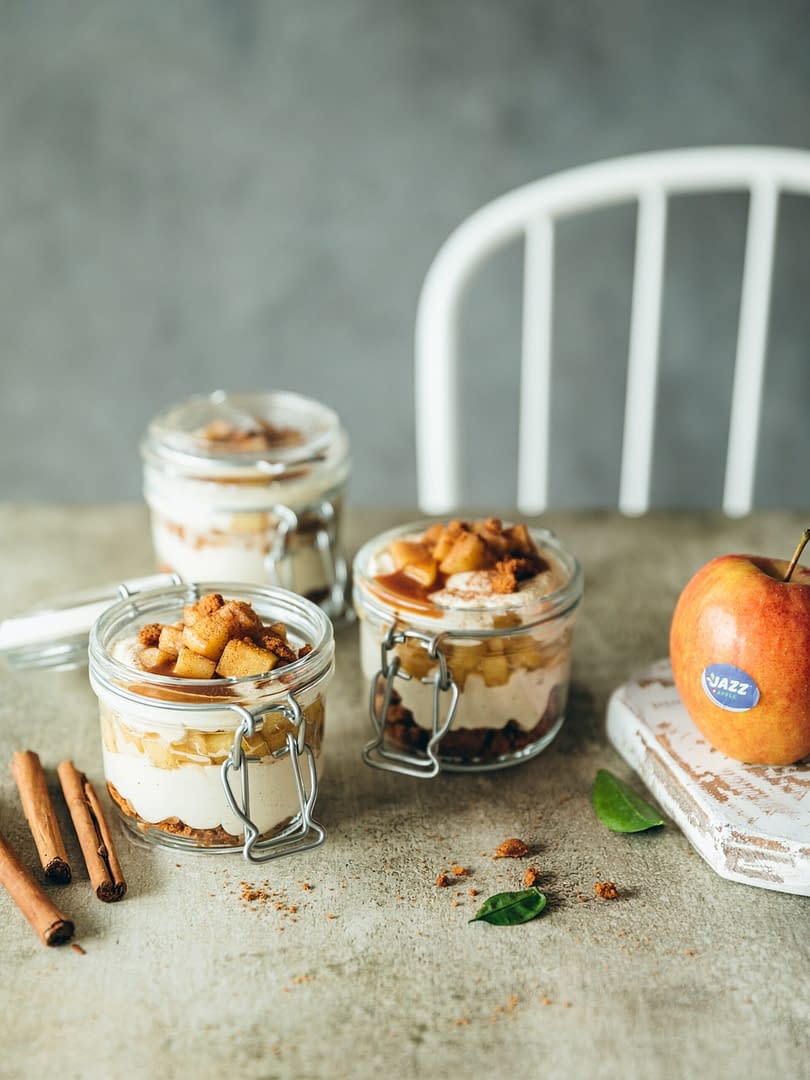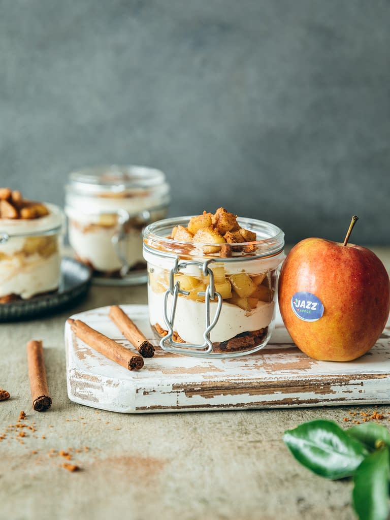 J’ai préparé cette recette en collaboration avec Jazz™, qui est une variété de pomme qui nous vient tout droit de Nouvelle-Zélande. Elle est implantée en Suisse depuis 2007 et cultivée en région lémanique, Valais, Seeland, Thurgovie, bien qu’on la retrouve partout dans le monde désormais.